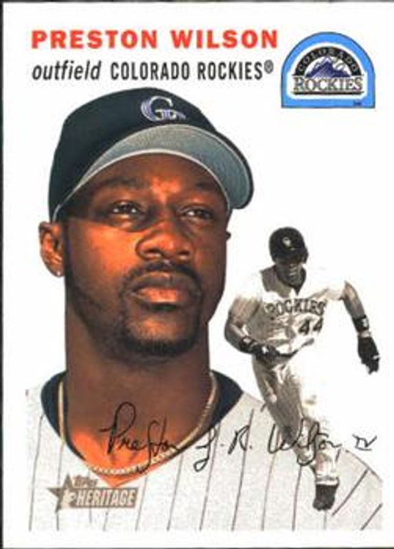 The Preston Wilson 2003 Topps Heritage #110 Base card is 1 of 3 Preston Wilson's card variations in the 2003 Topps Heritage set being tracked by Sports Card Investor, including Chrome /1954, and Chrome Refractor /554.