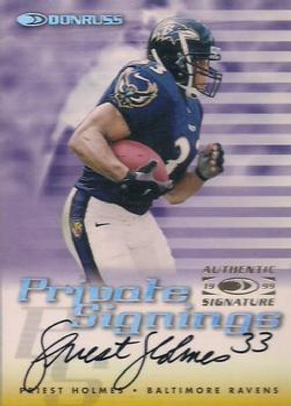 The Priest Holmes 1999 Donruss #NNO Private Signings card is 1 of 4 Priest Holmes' card variations in the 1999 Donruss set being tracked by Sports Card Investor, including Base, Stat Line Career /223, and Stat Line Season /14.