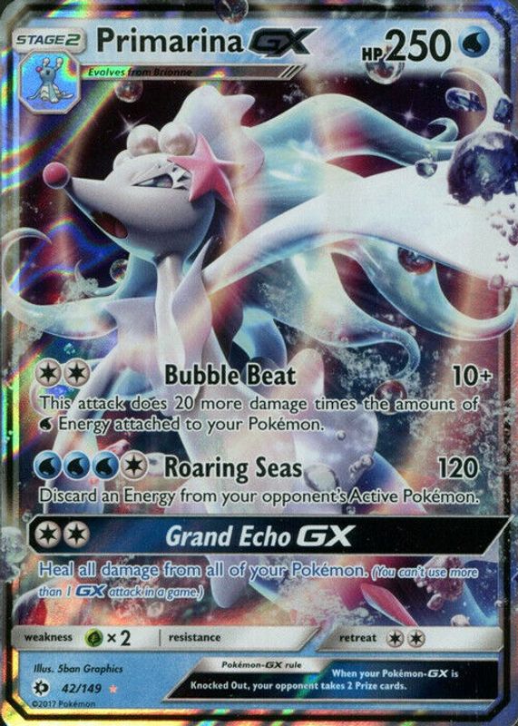 The Primarina GX 2017 Sun & Moon #042/149 Holo card in Raw TCG (Near Mint) condition has moved down -$4.34 (-54.3%) in the last 30 days and was last sold for $3.65 .