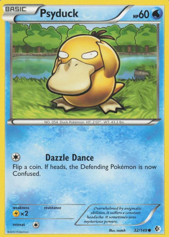 The Psyduck 2012 Black & White: Boundaries Crossed #032/149 Base card in Raw TCG (Lightly Played) condition has moved down -$3.72 (-55.4%) in the last 30 days and was last sold for $2.99 .