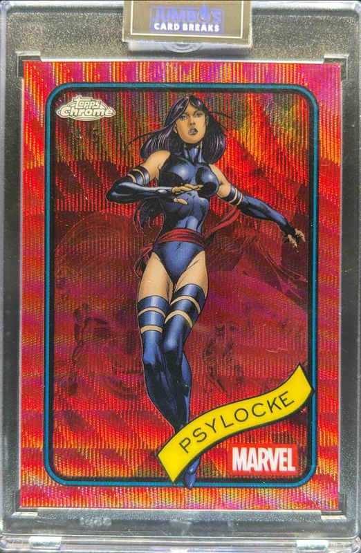 The Psylocke 2025 Topps Chrome #135 Red Wave Refractor /5 card is 1 of 29 Psylocke's card variations in the 2025 Topps Chrome set being tracked by Sports Card Investor, including Base, Refractor, Yellow Lava Refractor, Spider Web Refractor /399, and Blue Refractor /299.