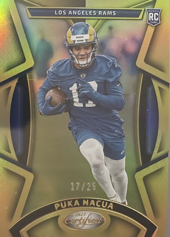 The Puka Nacua 2023 Certified #143 Mirror Gold /25 Rookie card in Raw condition has not changed in price in the last 30 days and was last sold for $77.00 .