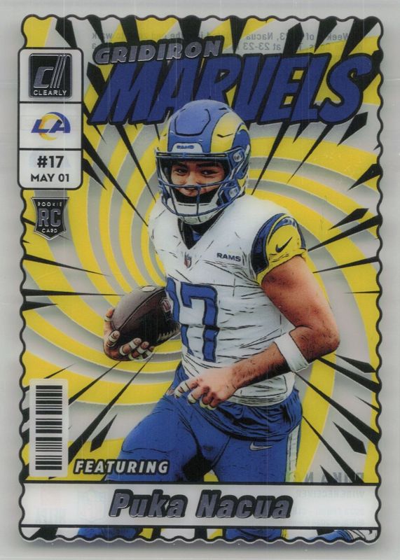 The Puka Nacua 2023 Clearly Donruss #18 Gridiron Marvels /(SSP) Rookie card in Raw condition has not changed in price in the last 30 days and was last sold for $109.00 .