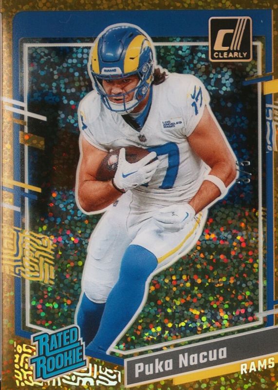 This card is 1 of 19 Puka Nacua's card variations in the 2023 Clearly Donruss set being tracked by Sports Card Investor, including Base, Gold, Holo Mosaic, Holo Rated Rookie Logo, and Purple /199.