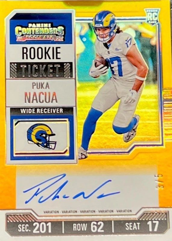 The Puka Nacua 2023 Contenders #125 Rookie Ticket Auto Variation - Goal Line Ticket /5 card in Raw condition has not changed in price in the last 30 days and was last sold for $1,750.00 .