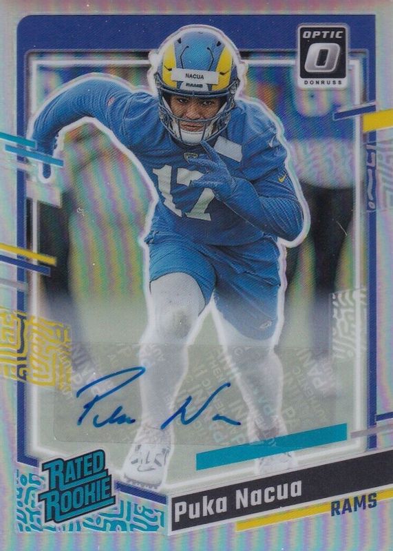 The Puka Nacua 2023 Donruss #357 Optic Rated Rookie Preview Autographs card in Raw condition has not changed in price in the last 30 days and was last sold for $190.00 .