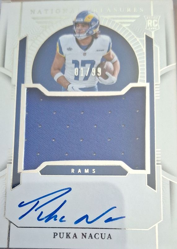 The Puka Nacua 2023 National Treasures #183 Rookie Patch Auto /99 card in Raw condition has not changed in price in the last 30 days and was last sold for $325.00 .
