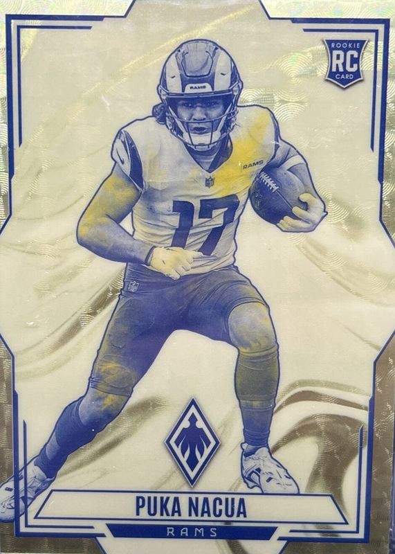 The Puka Nacua 2023 Phoenix #CON-13 Contours - Gold /1 Rookie card in Raw condition has not changed in price in the last 30 days and was last sold for $1,100.00 .