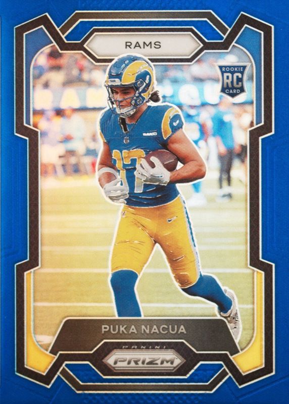 The Puka Nacua 2023 Prizm #357 Blue /(SSP) Rookie card in Raw condition has not changed in price in the last 30 days and was last sold for $182.50 .