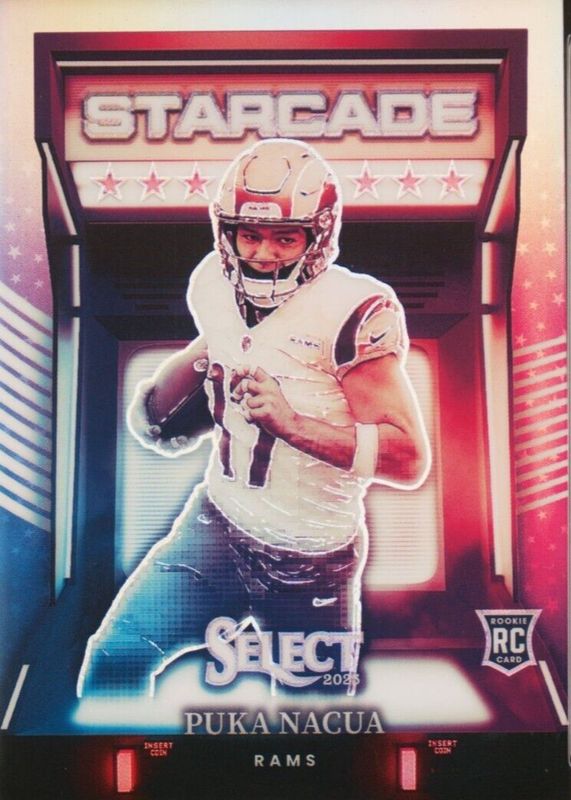 The Puka Nacua 2023 Select #STC-PNA Starcade /(SSP) Rookie card in Raw condition has not changed in price in the last 30 days and was last sold for $47.00 .