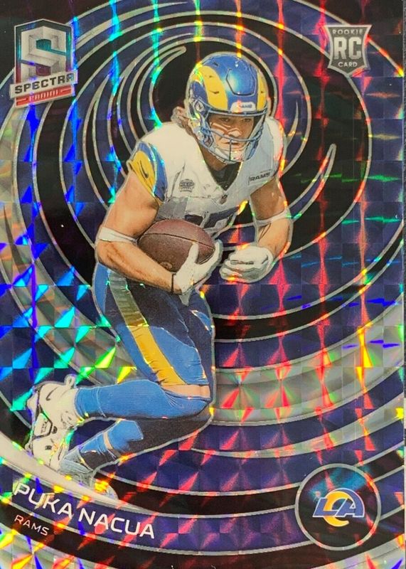 This card is 1 of 20 Puka Nacua's card variations in the 2023 Spectra set being tracked by Sports Card Investor, including Base, Silver, Celestial /99, Hyper /75, and Neon Blue Die-Cut /50.