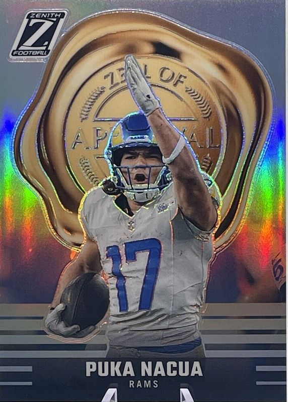 The Puka Nacua 2023 Zenith #30 Zeal of Approval - Silver Rookie card in Raw condition has not changed in price in the last 30 days and was last sold for $1.00 .