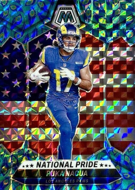 The Puka Nacua 2024 Mosaic #264 National Pride - Choice Peacock /(SSP) card in Raw condition has not changed in price in the last 30 days and was last sold for $57.00 .