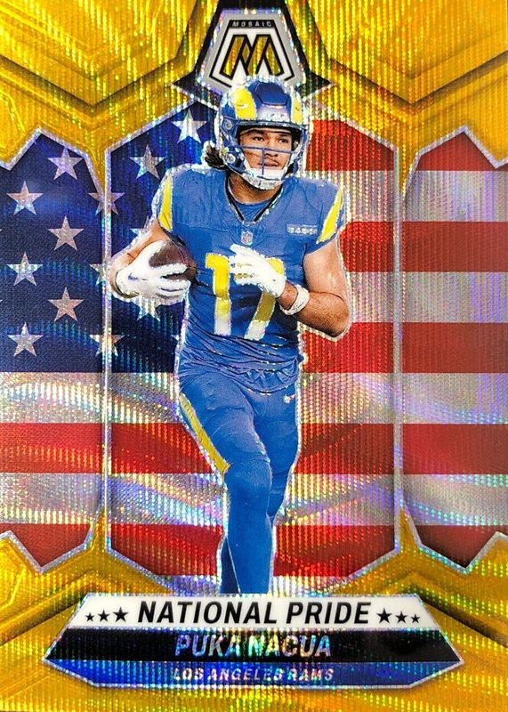 The Puka Nacua 2024 Mosaic #264 National Pride - Gold Wave /17 card in Raw condition has not changed in price in the last 30 days and was last sold for $56.51 .