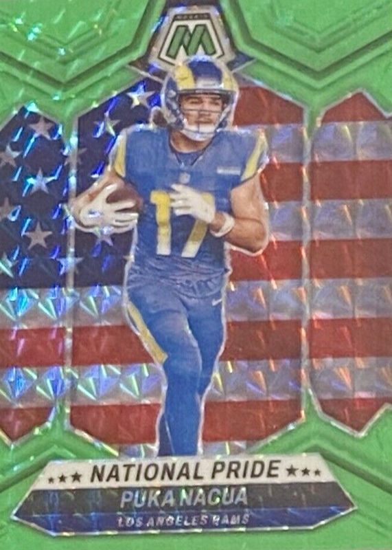 The Puka Nacua 2024 Mosaic #264 National Pride - Green Fluorescent /10 card in Raw condition has not changed in price in the last 30 days and was last sold for $51.00 .