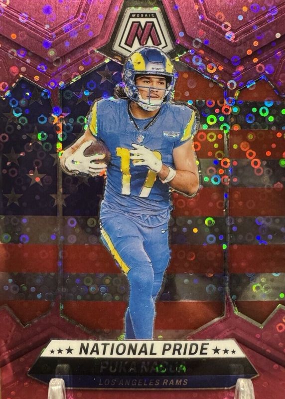 The Puka Nacua 2024 Mosaic #264 National Pride - No Huddle Pink /20 card in Raw condition has not changed in price in the last 30 days and was last sold for $25.00 .