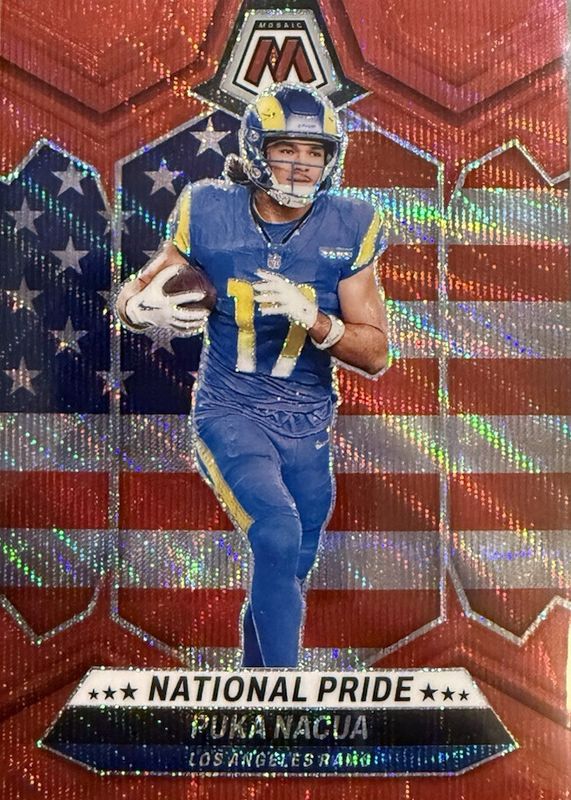 The Puka Nacua 2024 Mosaic #264 National Pride - Red Wave /9 card in Raw condition has not changed in price in the last 30 days and was last sold for $35.00 .
