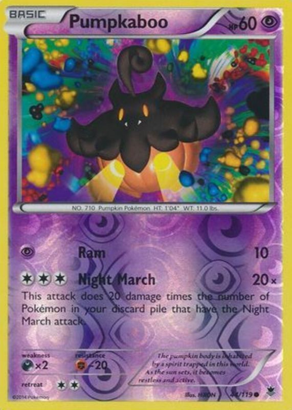 The Pumpkaboo 2014 XY: Phantom Forces #044/119 Reverse Holo card in Raw TCG (Near Mint) condition has not changed in price in the last 30 days and was last sold for $1.78 .