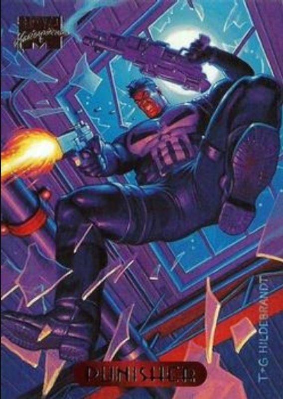 The Punisher 1994 Fleer Marvel Masterpieces Hildebrandt Brothers #94 Base card is 1 of 5 Punisher's card variations in the 1994 Fleer Marvel Masterpieces Hildebrandt Brothers set being tracked by Sports Card Investor, including Gold Foil Signatures, Bronze Holofoils, Gold Holofoils, and Silver Holofoils.