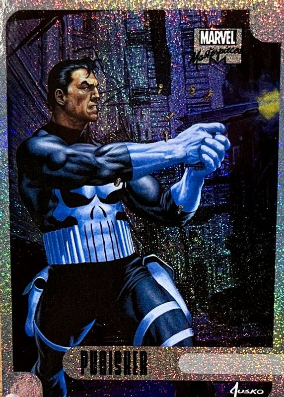 This card is 1 of 5 Punisher's card variations in the 2016 Upper Deck Marvel Masterpieces set being tracked by Sports Card Investor, including Base (/999), Epic Purple Foil /199, Orange Foil /99, and Speckle Holofoil /99.