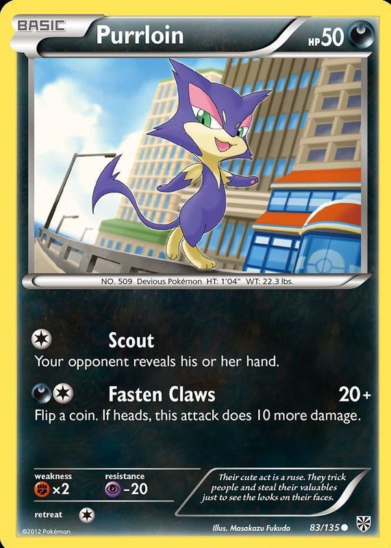 The Purrloin 2013 Black & White: Plasma Storm #083/135 Base card in Raw TCG (Lightly Played) condition has not changed in price in the last 30 days and was last sold for $1.90 .