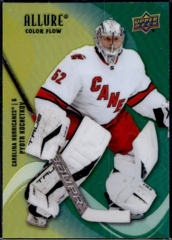 The Pyotr Kochetkov 2022 Upper Deck Allure #SF-97 Color Flow Yellow - Green Rookie card is 1 of 38 Pyotr Kochetkov's card variations in the 2022 Upper Deck Allure set being tracked by Sports Card Investor, including Base, Black Rainbow, Glitter Bomb, Orange Slice, and Pink Leopard.