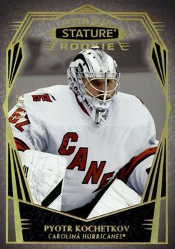 The Pyotr Kochetkov 2022 Upper Deck Stature #122 Design Variant /65 Rookie card is 1 of 47 Pyotr Kochetkov's card variations in the 2022 Upper Deck Stature set being tracked by Sports Card Investor, including Base /399, Green /99, Photo Variant /99, Red /75, and Photo Variant Green /66.