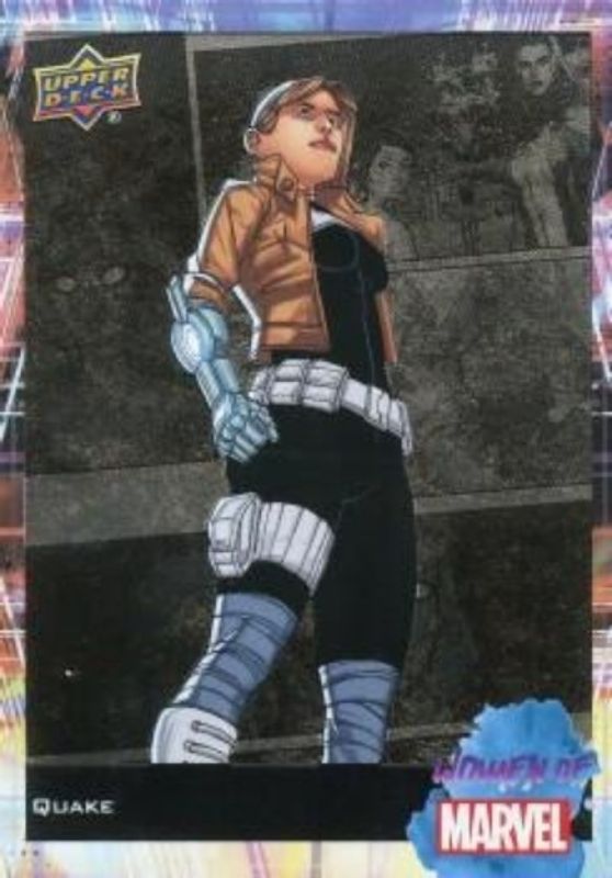 The Quake 2024 Upper Deck Women of Marvel #74 Base card is 1 of 7 Quake's card variations in the 2024 Upper Deck Women of Marvel set being tracked by Sports Card Investor, including Foil Lt Fx Blue, Foil Lt Fx Copper, Foil Lt Fx Red, Foil Lt Fx Green /99, and Foil Lt Fx Gold /33.