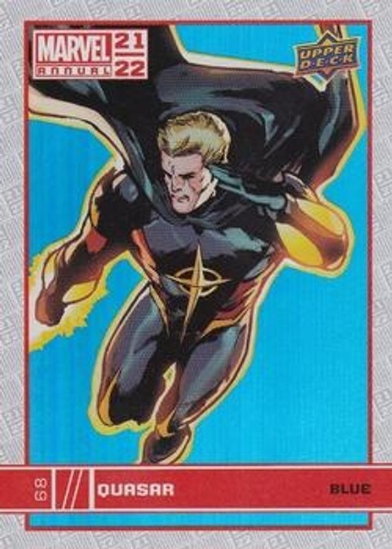 The Quasar 2021 Upper Deck Marvel Annual #68 Blue card is 1 of 15 Quasar's card variations in the 2021 Upper Deck Marvel Annual set being tracked by Sports Card Investor, including Base, Canvas Variant, Green, Magenta, and Red.