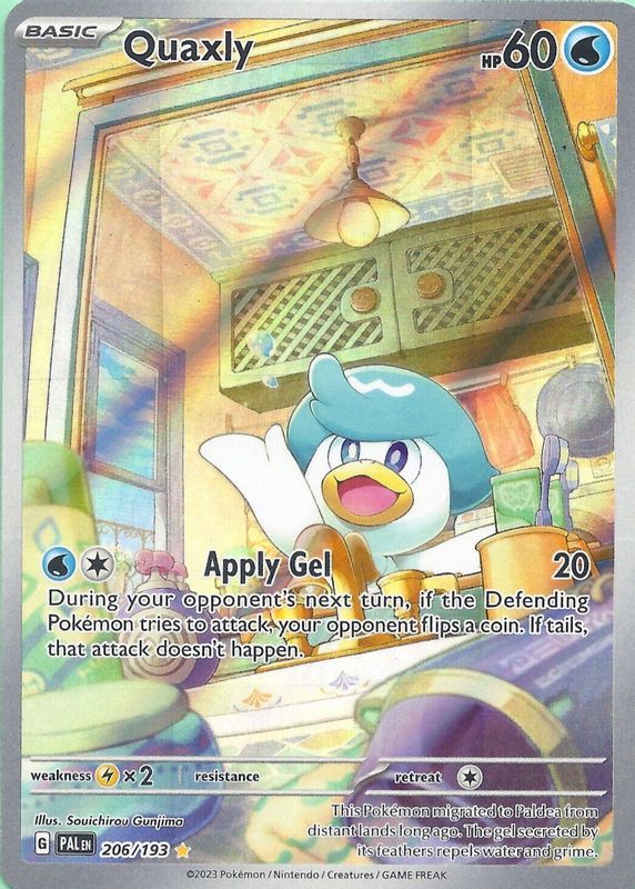 The Quaxly 2023 Scarlet & Violet: Paldea Evolved #206/193 Illustration Rare card in Raw TCG (Near Mint) condition has moved up $0.01 (+0.1%) in the last 30 days and was last sold for $8.51 .