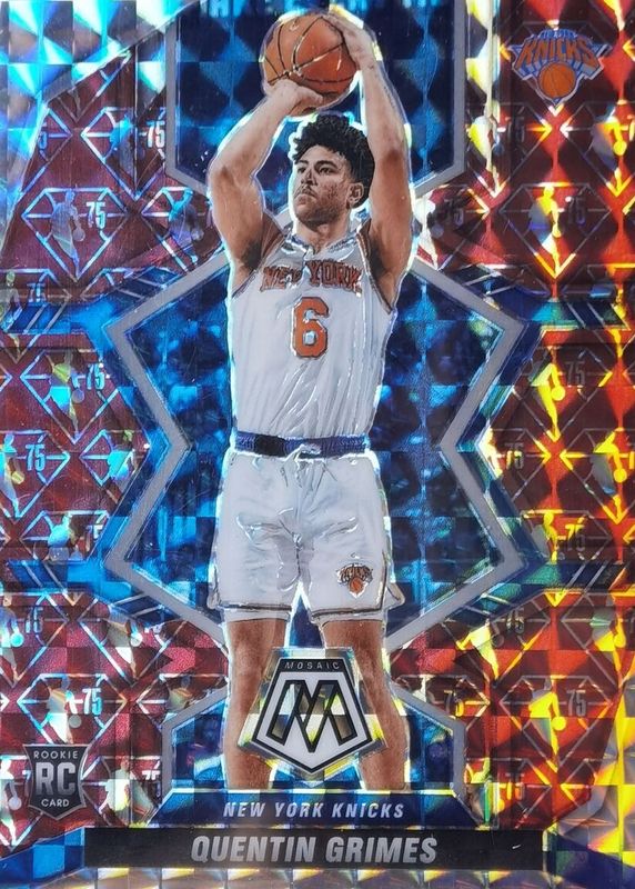 The Quentin Grimes 2021 Mosaic #223 NBA 75th Anniversary Rookie card in Raw condition has not changed in price in the last 30 days and was last sold for $9.38 .