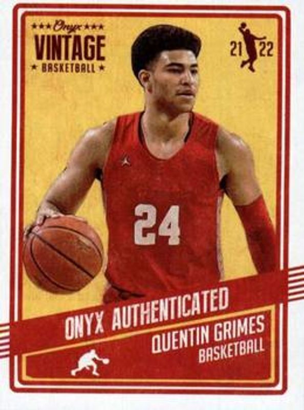 The Quentin Grimes 2021 Onyx Vintage #VBQG Base Rookie card is 1 of 5 Quentin Grimes' card variations in the 2021 Onyx Vintage set being tracked by Sports Card Investor, including Black Signatures, Blue Signatures, Green Signatures, and Red Signatures.