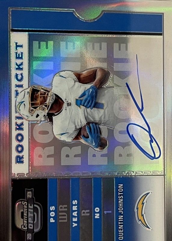 This card is 1 of 52 Quentin Johnston's card variations in the 2023 Contenders Optic set being tracked by Sports Card Investor, including Rookie of the Year Contenders Autographs (/99), Rookie of the Year Contenders Autographs - Blue (/75), Rookie Ticket Auto, Rookie Ticket Auto - Red (/125), and Rookie Ticket Auto - Silver.