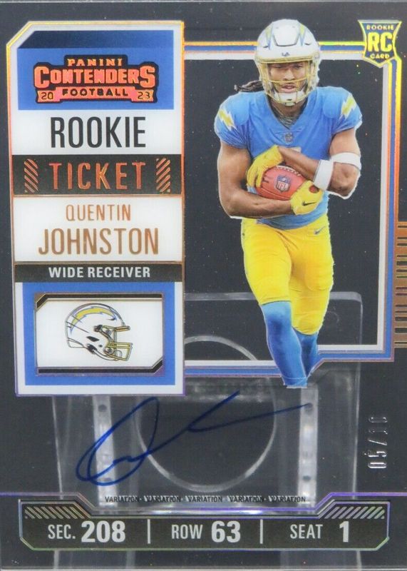 This card is 1 of 31 Quentin Johnston's card variations in the 2023 Contenders set being tracked by Sports Card Investor, including Rookie Ticket Auto, Rookie Ticket Auto - Opening Kickoff Ticket, Rookie Ticket Auto - Red Zone Ticket, Rookie Ticket Auto - Ticket Stub (/1), and Rookie Ticket Auto Variation.