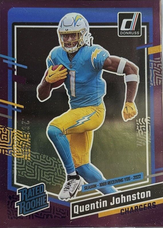 The Quentin Johnston 2023 Donruss #353 Season Stat Line (/500) Rookie card in Raw condition has not changed in price in the last 30 days and was last sold for $1.04 .