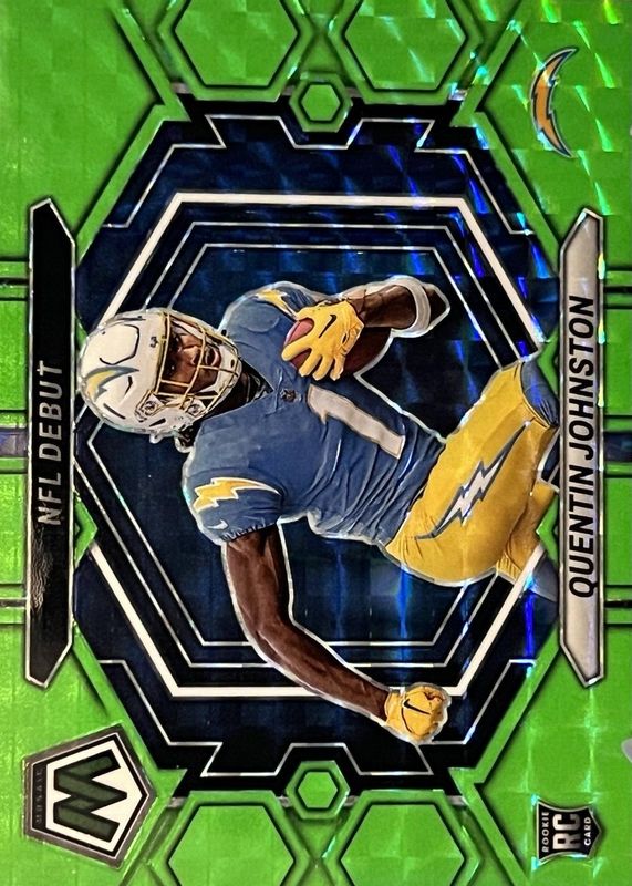 The Quentin Johnston 2023 Mosaic #ND-16 NFL Debut - Green Fluorescent /10 Rookie card in Raw condition has not changed in price in the last 30 days and was last sold for $125.00 .