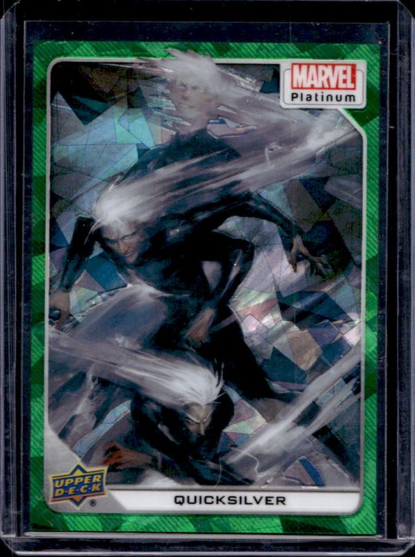The Quicksilver 2023 Upper Deck Marvel Platinum #50 Green Crackle /99 card is 1 of 44 Quicksilver's card variations in the 2023 Upper Deck Marvel Platinum set being tracked by Sports Card Investor, including Base, Black Rainbow, Blue Rainbow, Blue Surge, and Purple Rainbow.
