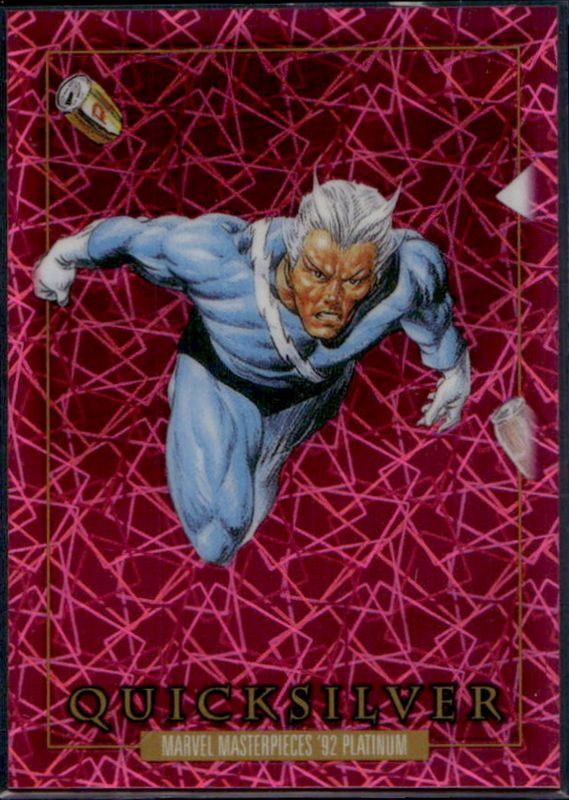 The Quicksilver 2024 Upper Deck Marvel Masterpieces '92 Platinum #71 Pink Laser /992 card is 1 of 38 Quicksilver's card variations in the 2024 Upper Deck Marvel Masterpieces '92 Platinum set being tracked by Sports Card Investor, including Base, Blue Traxx, Canvas, Clear Cut, and Emerald Surge.