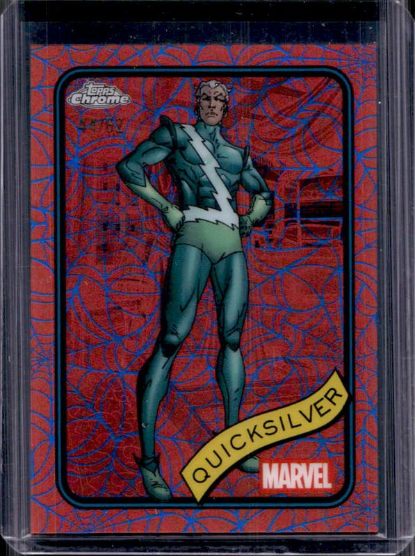 The Quicksilver 2025 Topps Chrome #121 Blue & Red Spider Web Refractor /62 card is 1 of 23 Quicksilver's card variations in the 2025 Topps Chrome set being tracked by Sports Card Investor, including Base, Refractor, Yellow Lava Refractor, Spider Web Refractor /399, and Blue Refractor /299.