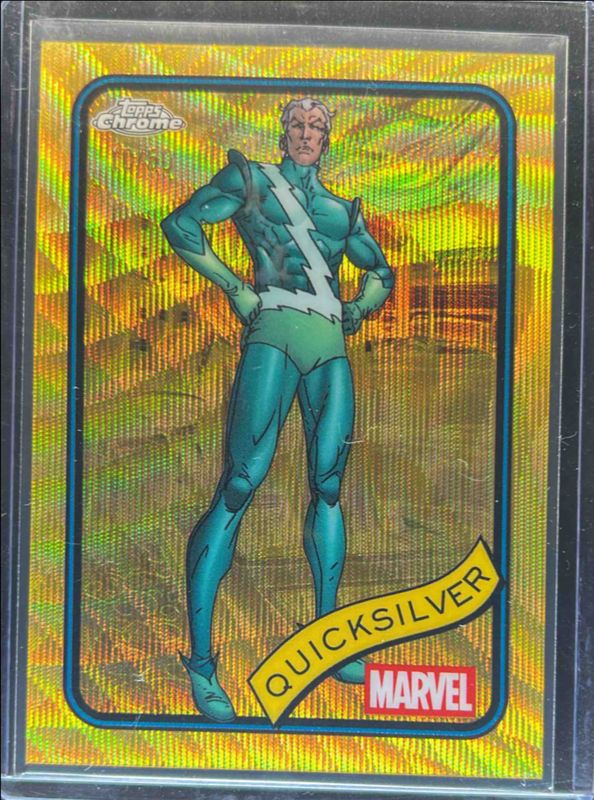 The Quicksilver 2025 Topps Chrome #121 Gold Wave Refractor /50 card is 1 of 23 Quicksilver's card variations in the 2025 Topps Chrome set being tracked by Sports Card Investor, including Base, Refractor, Yellow Lava Refractor, Spider Web Refractor /399, and Blue Refractor /299.