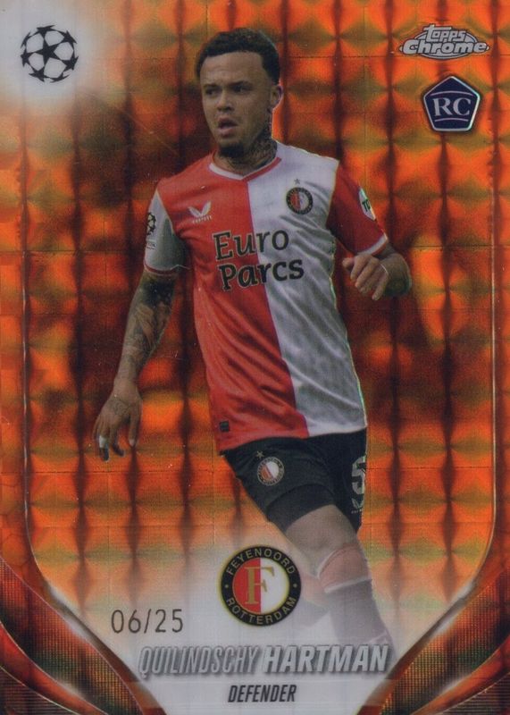 The Quilindschy Hartman 2023 Topps Chrome UEFA Club Competitions #185 Orange Refractor /25 Rookie card in Raw condition has not changed in price in the last 30 days and was last sold for $8.00 .