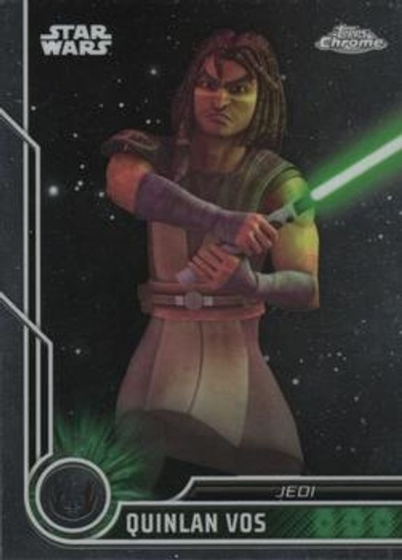 The Quinlan Vos 2023 Topps Chrome Star Wars #50 Base card is 1 of 11 Quinlan Vos' card variations in the 2023 Topps Chrome Star Wars set being tracked by Sports Card Investor, including Black Wave, Purple Wave, Refractor, Aqua /199, and Blue /150.