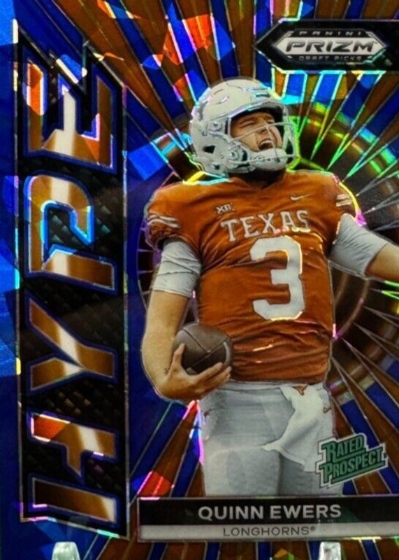 The Quinn Ewers 2024 Prizm Draft Picks #HP-QE Hype - Blue Ice /99 card in Raw condition has not changed in price in the last 30 days and was last sold for $3.00 .