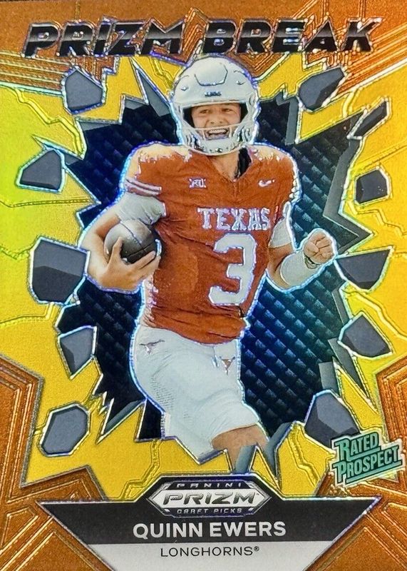 The Quinn Ewers 2024 Prizm Draft Picks #PB-QES Prizm Break - Black & Gold /5 card in Raw condition has not changed in price in the last 30 days and was last sold for $200.00 .