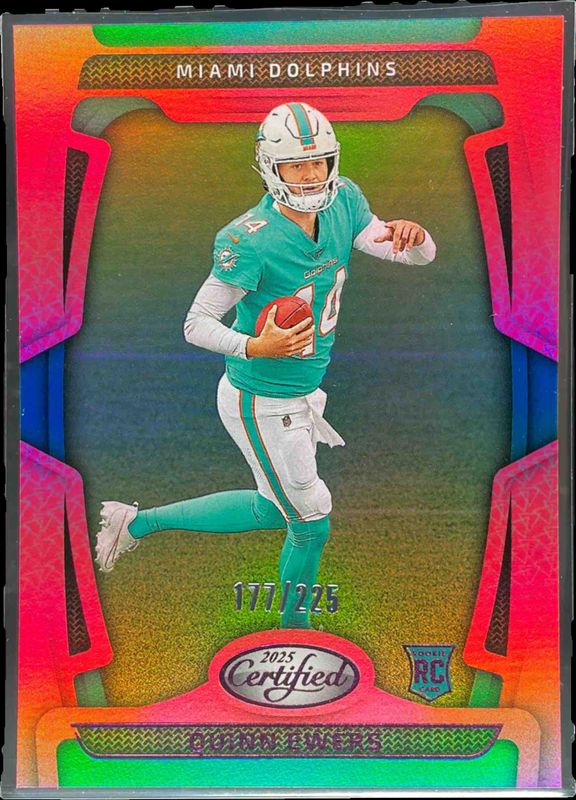 The Quinn Ewers 2025 Certified #111 Rookies - Mirror Pink /225 card is 1 of 62 Quinn Ewers' card variations in the 2025 Certified set being tracked by Sports Card Investor, including Base Rookie /499, Mirror /399, Mirror Purple /299, Mirror Pink /225, and Mirror Orange /150.
