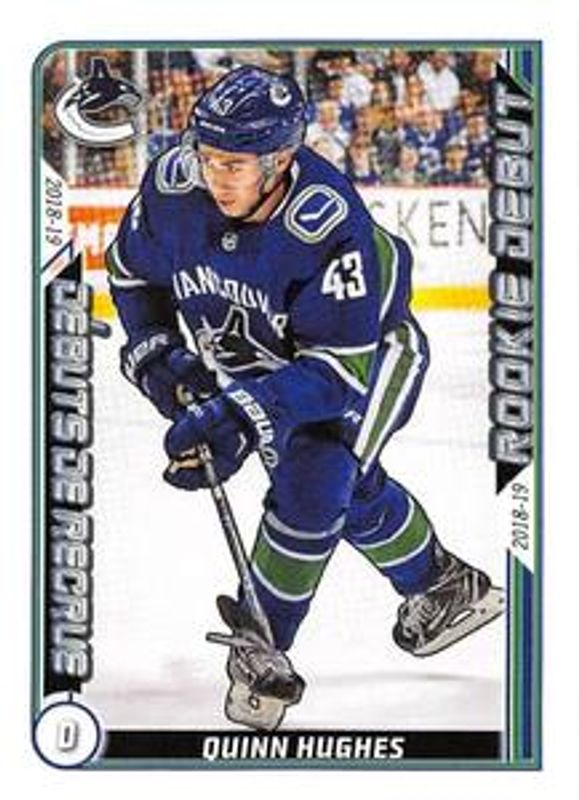 The Quinn Hughes 2019 Topps Stickers #541 Base Rookie card is 1 of 2 Quinn Hughes' card variations in the 2019 Topps Stickers set being tracked by Sports Card Investor, including Base.
