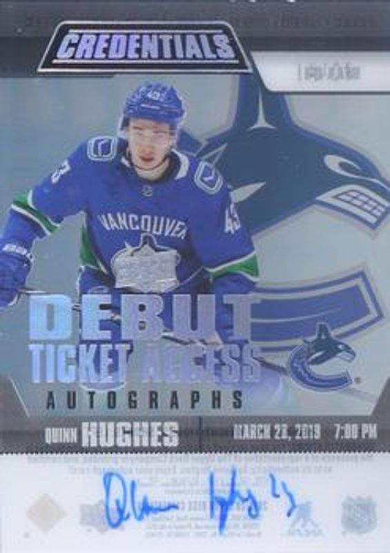 The Quinn Hughes 2019 Upper Deck Credentials #RTAA-QH Debut Ticket Access Acetate Autographs /99 Rookie card is 1 of 21 Quinn Hughes' card variations in the 2019 Upper Deck Credentials set being tracked by Sports Card Investor, including Base /699, Red /99, Green /25, Purple /10, and Black /1.