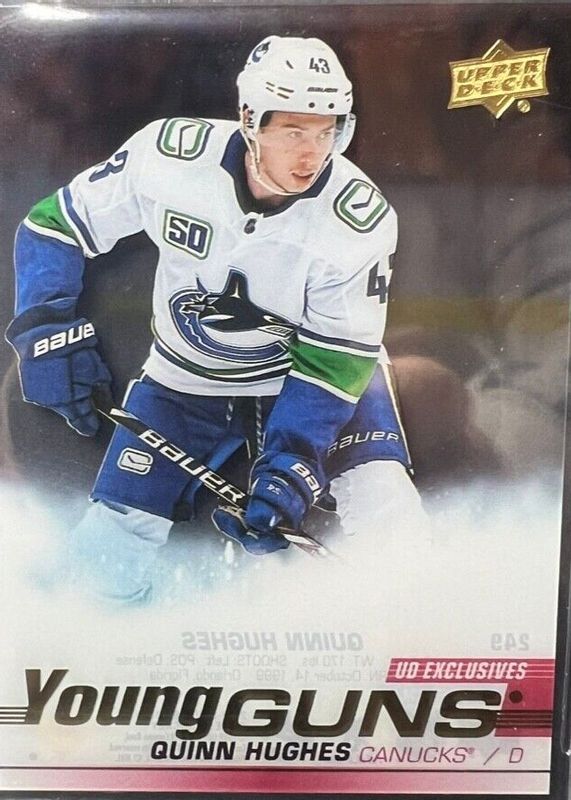 The Quinn Hughes 2019 Upper Deck #249 Young Guns - Clear Cut Exclusives Rookie card in Raw condition has not changed in price in the last 30 days and was last sold for $1,219.10 .
