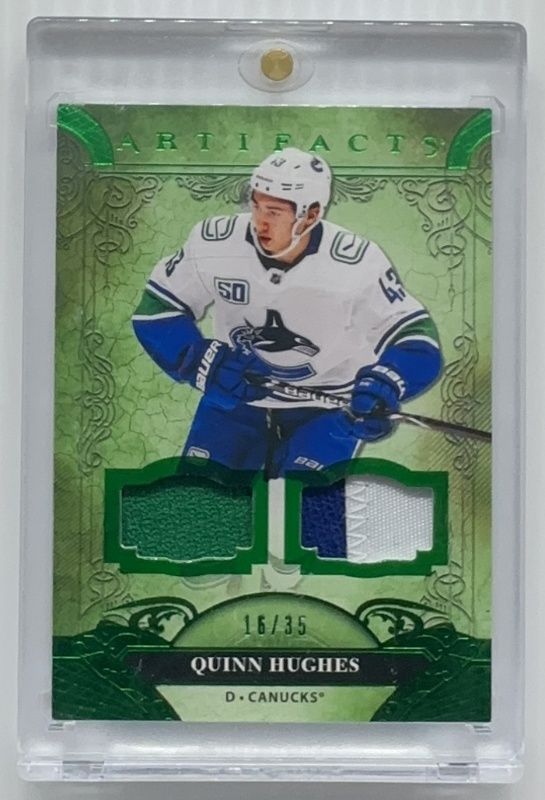 The Quinn Hughes 2020 Upper Deck Artifacts #103 Material - Emerald /65 card is 1 of 27 Quinn Hughes' card variations in the 2020 Upper Deck Artifacts set being tracked by Sports Card Investor, including Base /999, Ruby /399, Copper /299, Emerald /99, and Autumn /75.