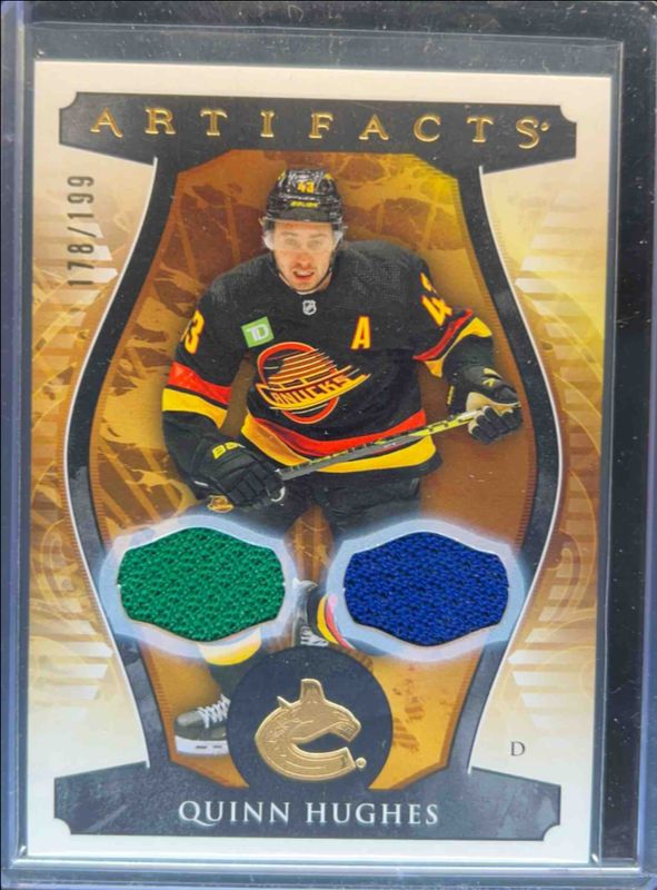 The Quinn Hughes 2023 Upper Deck Artifacts #129 Material - Gold /199 card is 1 of 35 Quinn Hughes' card variations in the 2023 Upper Deck Artifacts set being tracked by Sports Card Investor, including Base /999, Leather, Plexi, Turquoise, and Wood.